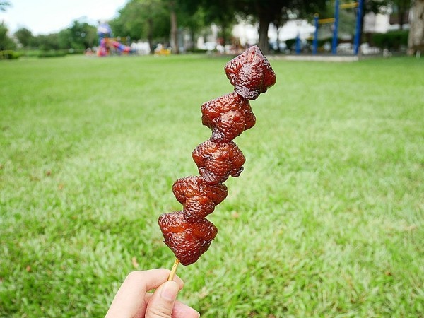 七里香一串共有五顆小屁屁,光是從雞皮的顏色就知道有多入味,湊近一聞香氣立刻撲鼻而來