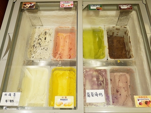 冰淇淋的口位非常多樣 除了常見的草莓、巧克力之外 還有酒釀櫻桃、葡萄優格等等