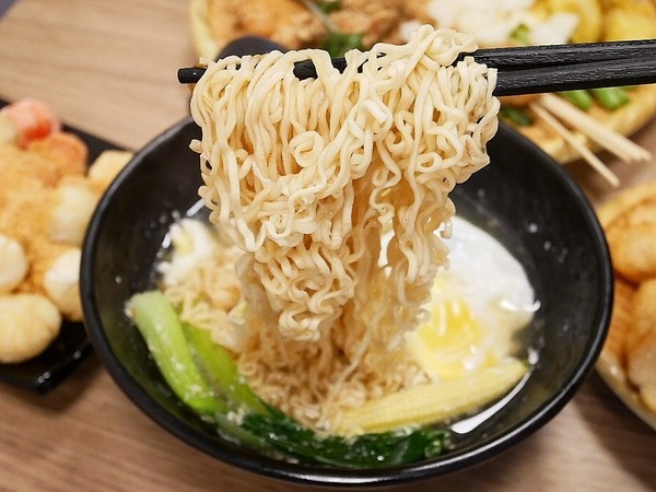 這碗泡麵裡面有貢丸、蛤蜊、玉米筍、青江菜和一顆蛋 有點像是鍋燒麵的概念