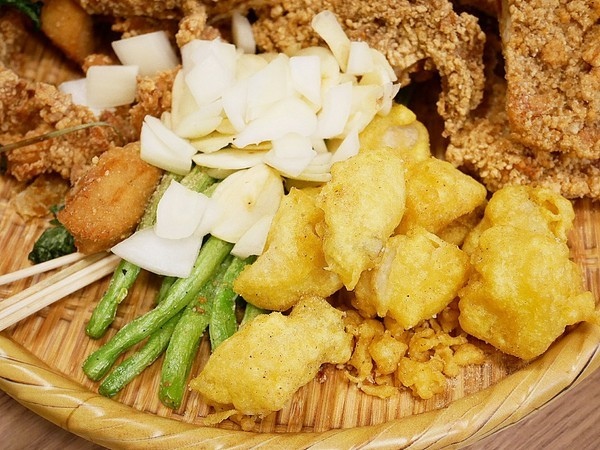 金黃炸物全部堆疊在一起 竹籃份量十足