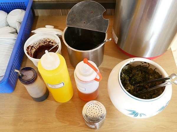店家的調味料都放在餐具旁邊 其中酸菜也是讓顧客自取 不過記得要適量取用 互相尊重很重要