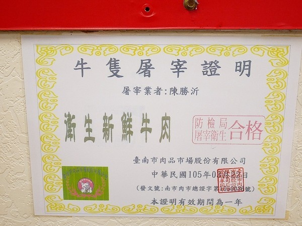 店家在櫃台貼出一張防檢局屠宰衛生的合格證明