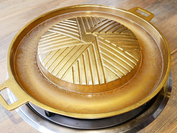 其中韓式料理最讓人稱讚的一點 就是多餘的脂肪和醬汁會隨著銅盤上一條一條的溝流出去
