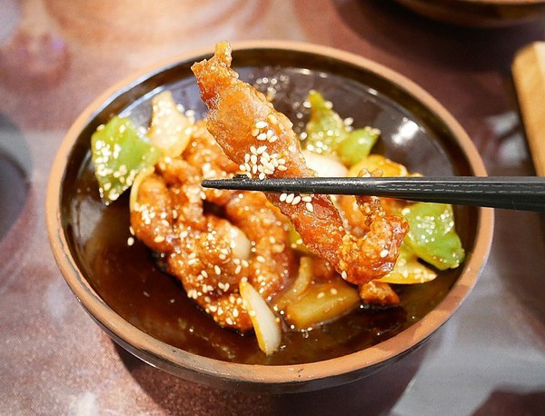 糖醋醬汁微酸甜 均勻將雞丁包裹 所以每一口都超夠味