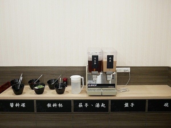 品町採半自助式 飲品、調料和餐具全都集中在店內一側