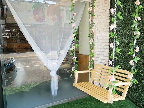 店家外面這個盪鞦韆是木質的 陽光剛好灑落在一側