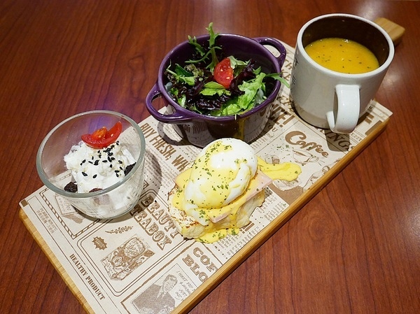 男友挑的美式套餐包含班尼迪克蛋、美式鮪魚馬鈴薯、優格沙拉、主廚湯品和$60飲品