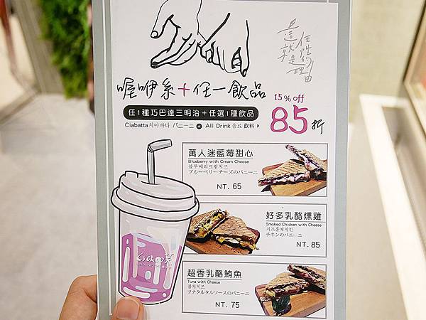 目前店內還有巧巴達三明治 + 任意飲品 即享85折優惠