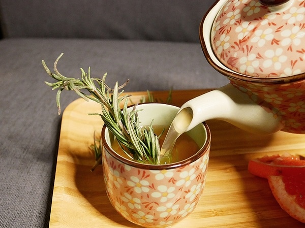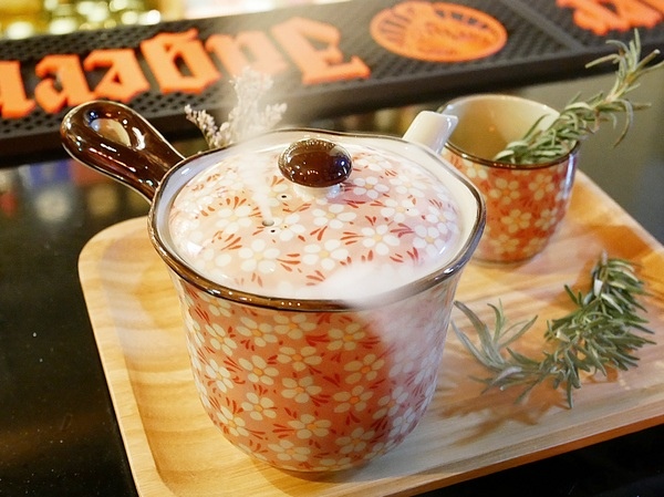 杯中插著迷迭香,所以這杯調酒喝起來除了有茶香、果香,還帶點迷迭香氣