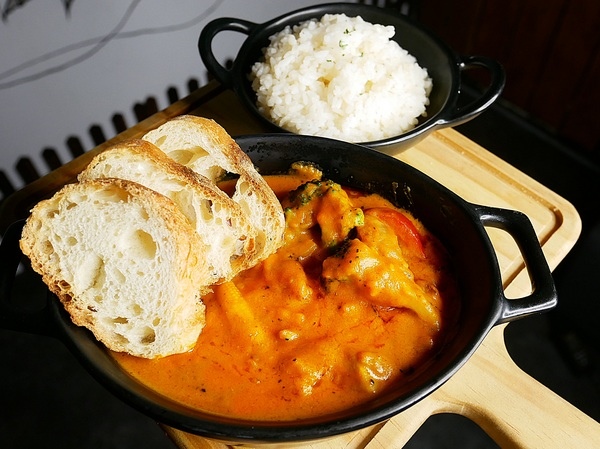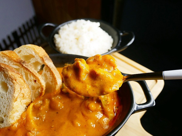 除了會附一碗白飯外,還插了三塊法國麵包,而且整鍋料滿滿的紅咖哩醬汁,相當東南亞風