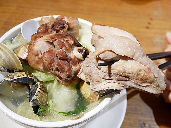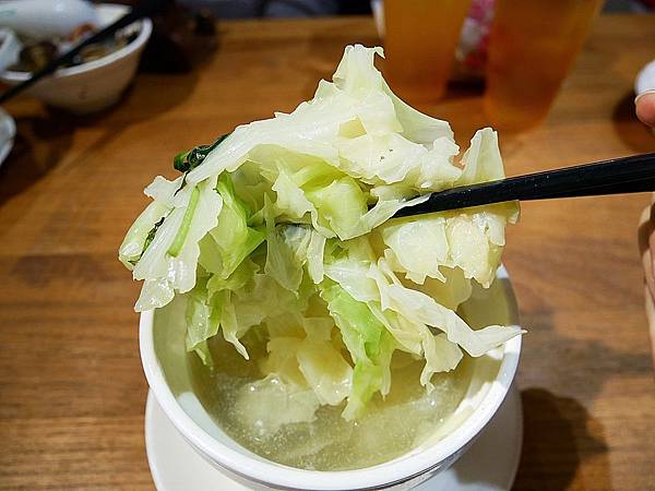 湯品裡面有滿滿高山高麗菜、蛤蜊 以及超大塊雞肉,喝起來清甜不油膩,重點是即使把料撈起湯還是很大碗,入口濃濃高麗菜和蛤蜊的甜香氣相當順口。高麗菜給得大方,入口清甜脆口很好吃