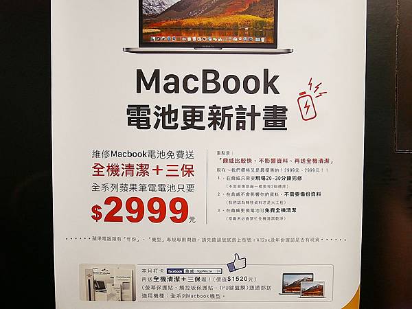最近甚至推出維修電池就免費送全機清潔和三保 (螢幕保護貼、觸控板保護貼、TPU鍵盤膜)