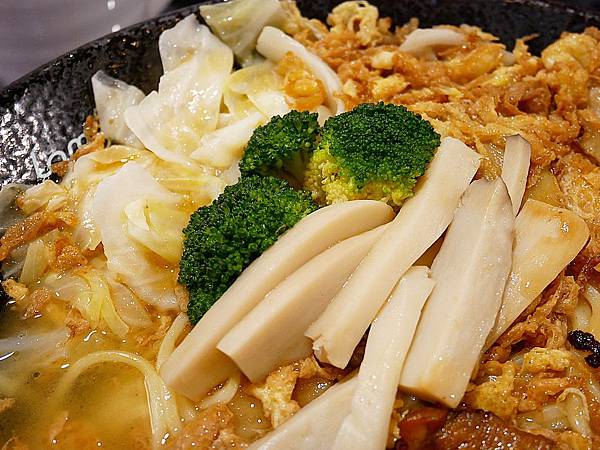 拉麵上頭搭配不少蔬菜,包含花椰菜、高麗菜和杏鮑菇等等