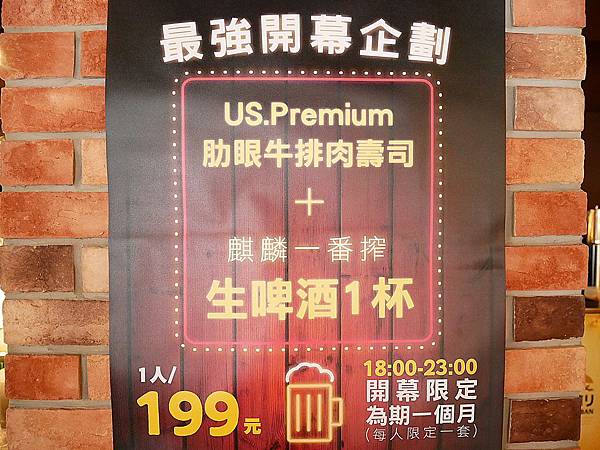 18:00~23:00 點選肋眼牛排肉壽司 + 生啤酒只要$199