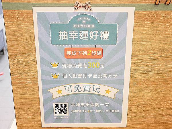目前消費滿$300並在臉書打卡分享,就可以玩夾扭蛋機,最大獎是4吋生日蛋糕喔
