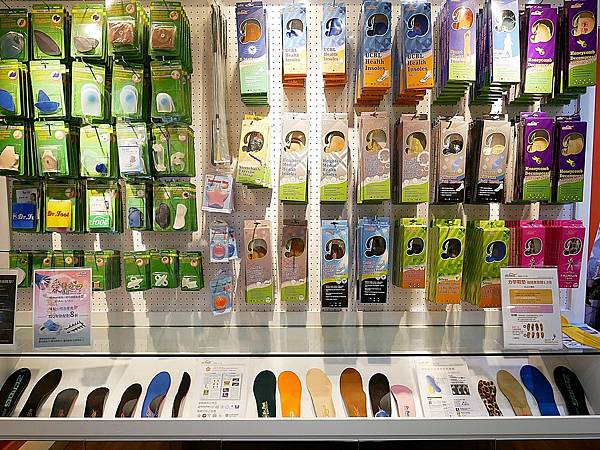 店內一側掛滿各式鞋墊和足部配件,都是用來讓腳部舒服一些的輔具