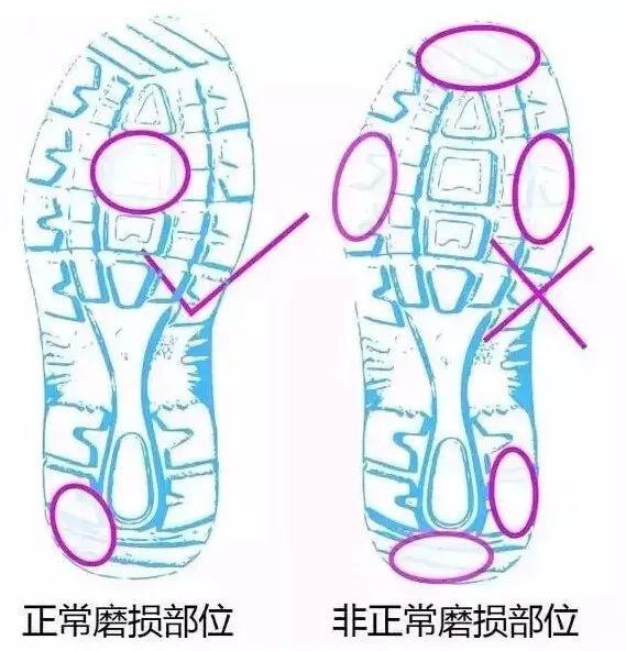 正常來說,應該如附圖上左邊那隻鞋子的位置才是正確磨損部位,其他都表示足部施力點不對