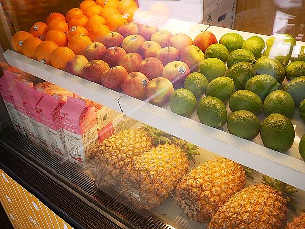 櫃檯旁邊有一個透明的冷藏冰箱,裡面擺放各種新鮮水果