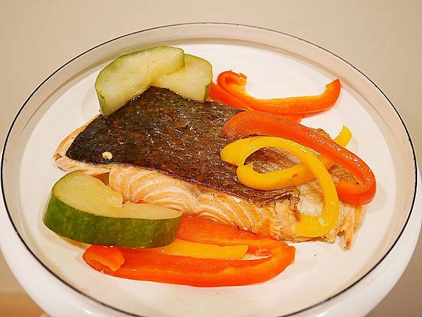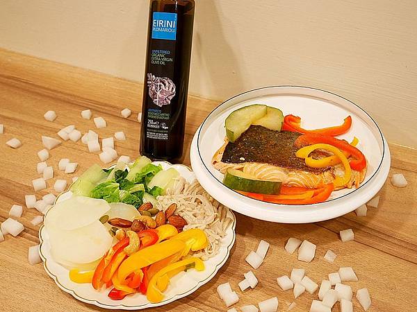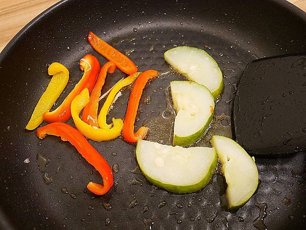 用煎完鮭魚剩下的橄欖油將一些蔬菜上色,不僅增加配色,吃起來也更清爽