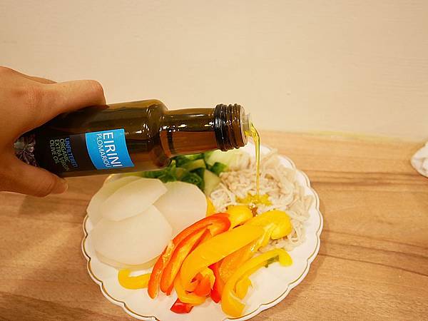 將蔬菜全部擺上盤子後,可以緩緩淋上一些橄欖油提味