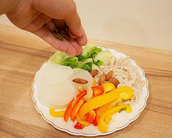 除了橄欖油,隨手再把櫃子裡的堅果拿出來配色和增加口感