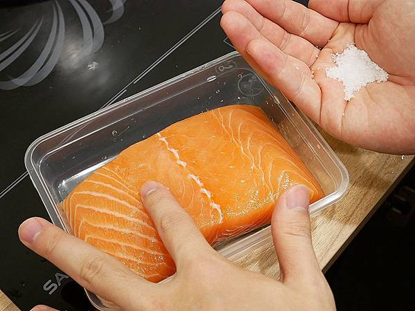 將鮭魚擦乾後,稍稍抹上一層鹽,依照自己的口味下手