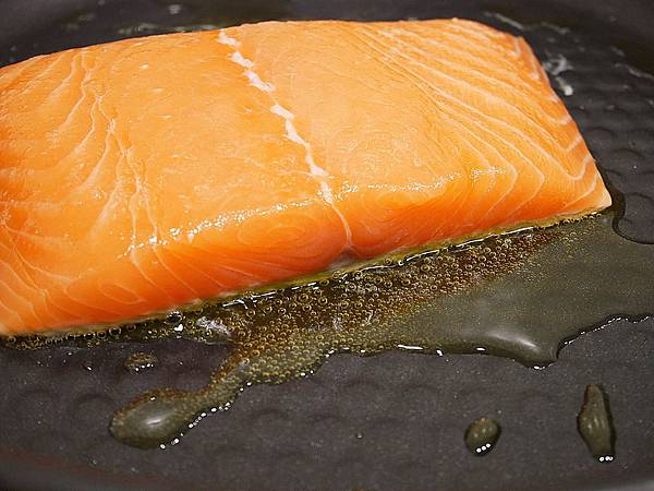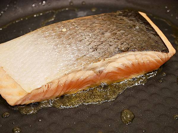 鮭魚在鍋上滋滋作響,鹹香氣立刻飄散出來