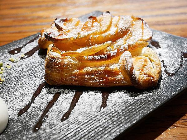 蘋果派稍有厚度,外層烤到酥脆,而中間有層次但濕潤