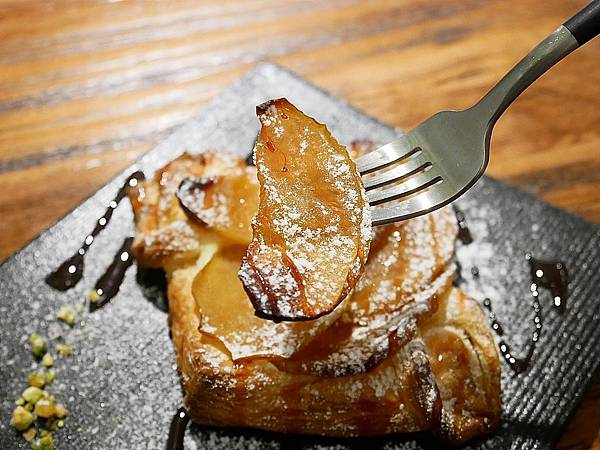 上頭鋪了焦糖蘋果,蘋果切成片狀,所以吃起來跟底下的派相當融合