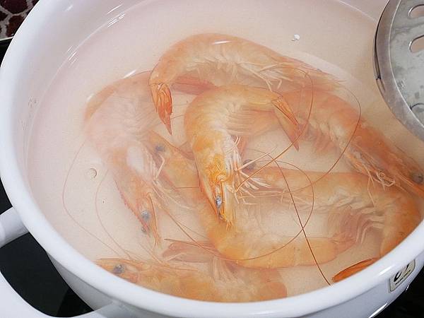 將蝦子稍微燙過,這樣番茄香氣煮出來之後放入蝦子很快就可以起鍋