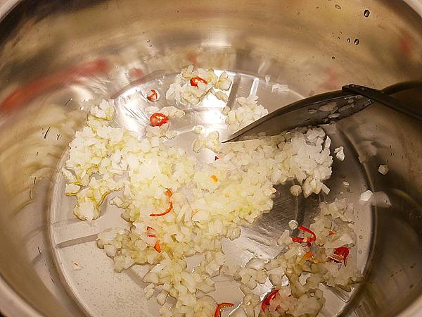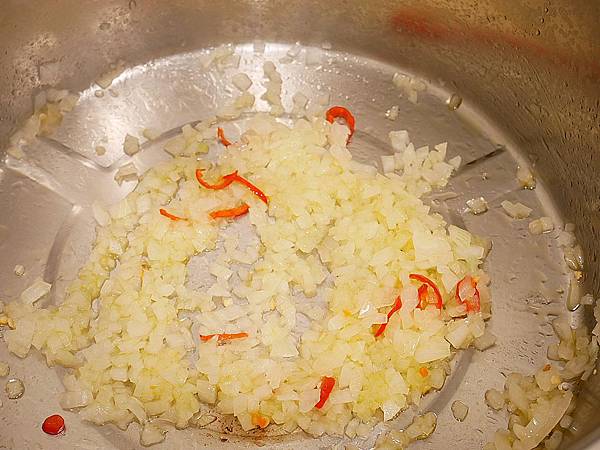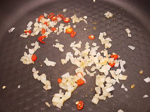 加入橄欖油後,一樣再放入洋蔥碎和辣椒碎拌炒