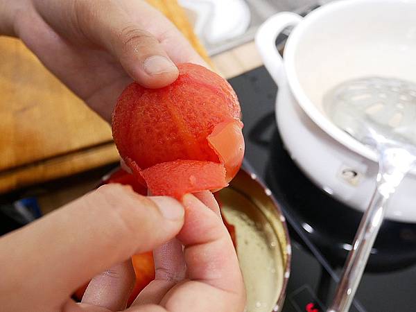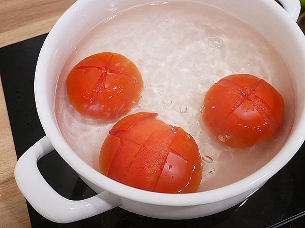 待水滾後將番茄放入,煮到皮變軟脫離番茄肉之後就可以撈起剝皮