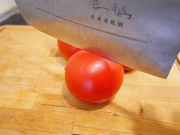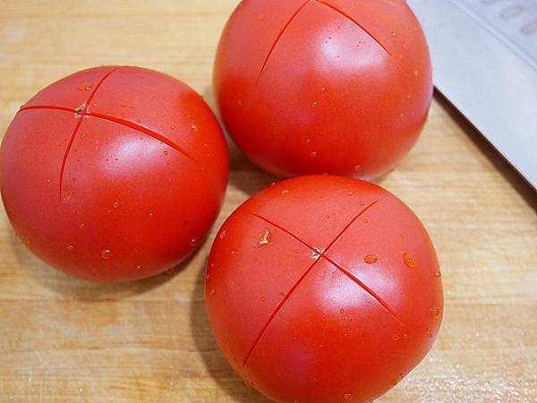 一開始在番茄的上頭畫十字,記得不要畫太深,以免番茄籽都流到湯裡