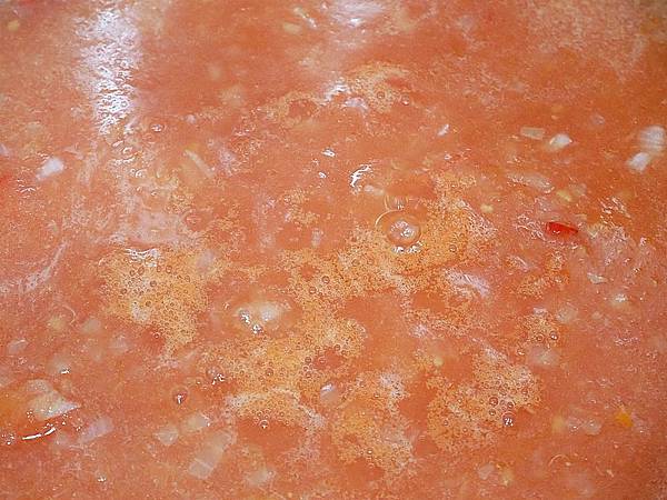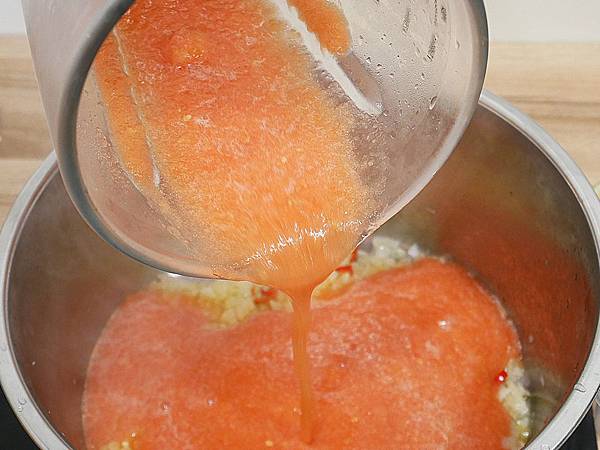 當香氣出來之後就可以加入打好的番茄泥,大家可以依照自己喜歡的濃度增減水量