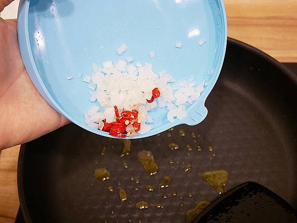 開火之前就可以先加入橄欖油,並下要拌炒的洋蔥碎、辣椒碎