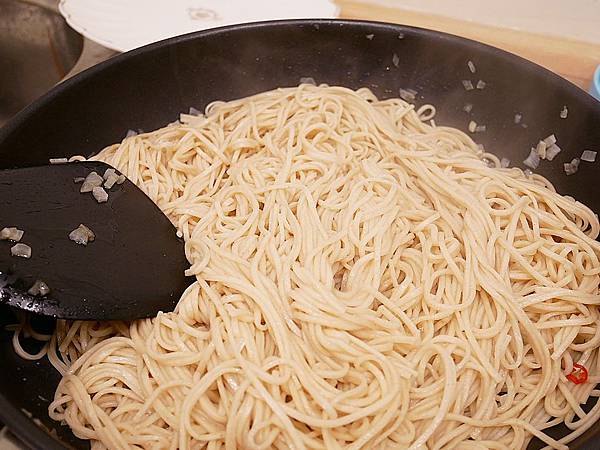 開火後稍微拌一下就會聞到濃濃洋蔥、辣椒和橄欖油的香氣,味道還不賴