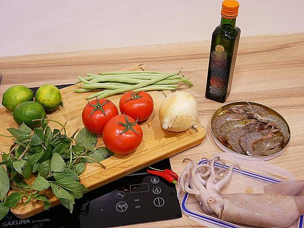食材包含 : Extra Virgin Olive Oil特級冷壓初榨橄欖油、喜歡的海鮮、番茄、洋蔥