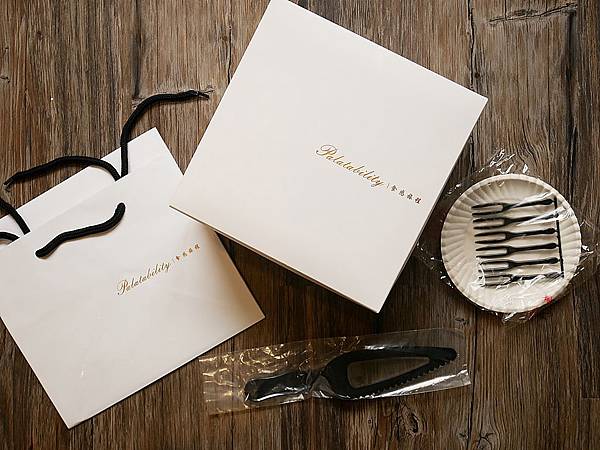蛋糕送來的時候會附上一個紙袋、餐盤和刀叉