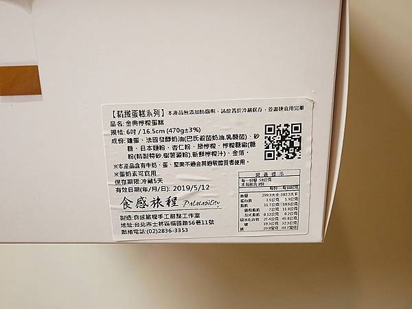 外包裝上貼著蛋糕的食材、大小、保存期限等等