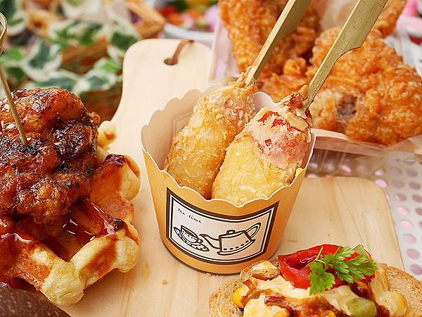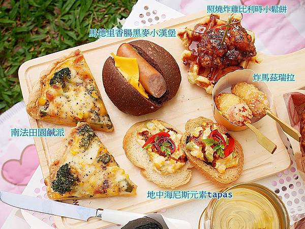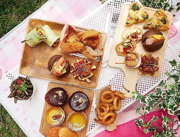 將野餐小食盒內的食物全部取出,一一擺上大家自備的盤子上,一點也不輸給餐廳的精緻感,小食盒內得食材種類相當豐富,數一數餐點加飲料共有15種,鹹甜都有,炸物烤物一應俱全~