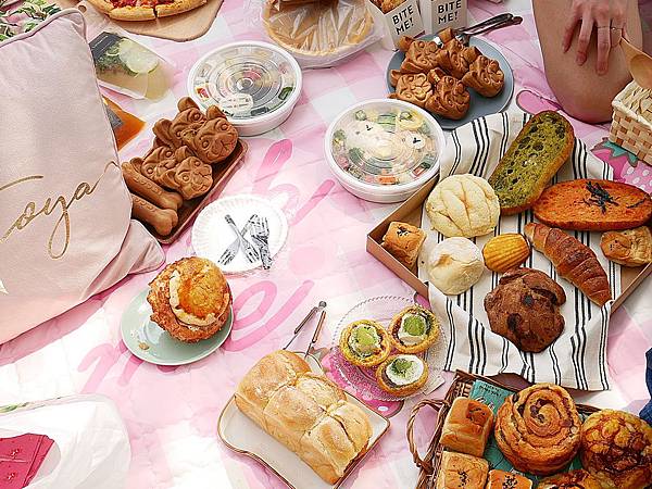 除了小食盒之外,大家真的是把自己喜歡或想吃的東西都買來了,網路知名的犬首燒、超夯麵包店的超多口味,以及可愛手作便當通通上桌,還有各式甜點、蛋糕、派等等,就連餐後水果也都貼心準備好,一看就知道我們肯定會在半路陣亡,因為真的準備太多!! 但不得不說,一次有這麼多食物擺在眼前真的很爽。
