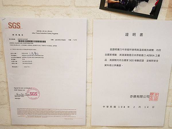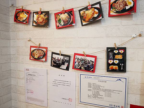 店家在牆上掛了餐點的實體照,同時也附上測試報告和證明書