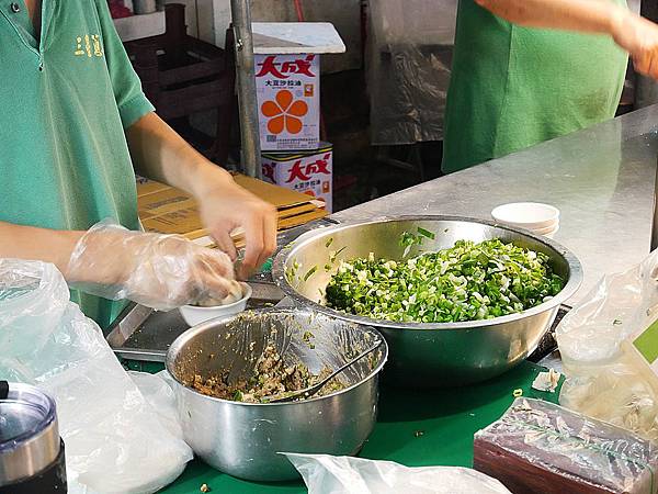 只見他快速舀起一大團肉放進麵皮內,再抓起滿滿一把蔥放上,大家都看得津津有味