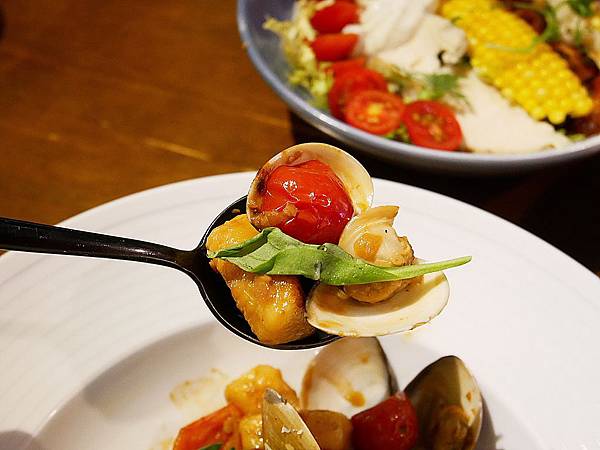 裡面加入番茄和芝麻葉做陪襯,搭配起來相當清爽