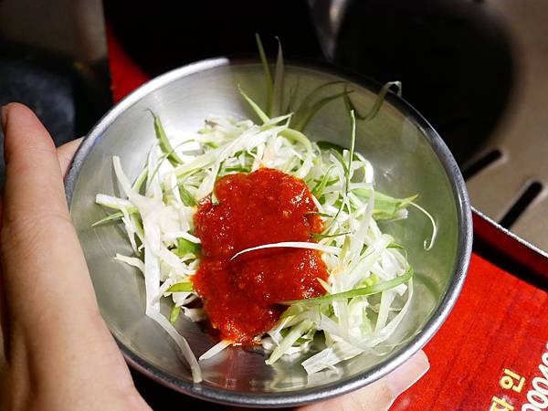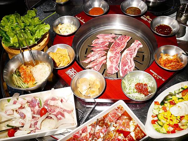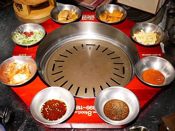 烤盤外圍放了一圈小菜和醬汁,這些都是免費提供而且免費續的