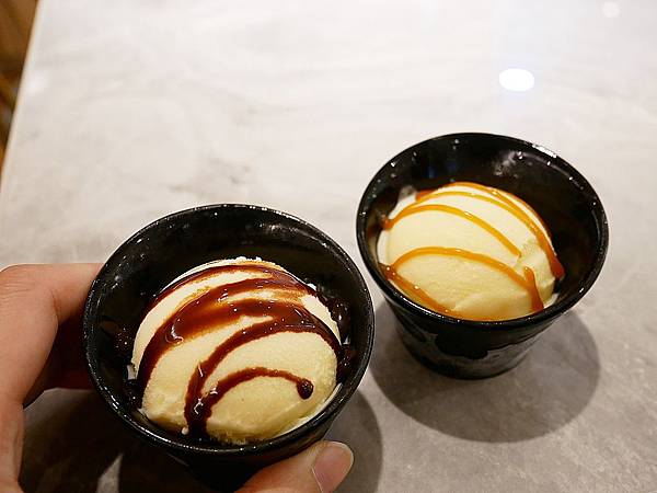 冰淇淋上頭會淋巧克力醬或焦糖醬,挖的時候不是非常軟的狀態,所以慢慢刮慢慢品嚐