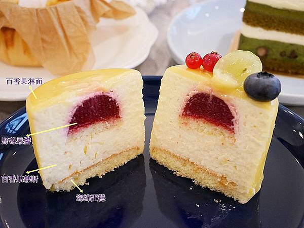最上層是使用淋面蛋糕的方式製作,入口是百香果香氣,單吃也不會太甜,相當令人驚艷