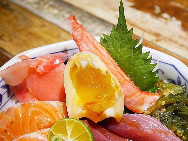 除了三種生魚片之外,還有蟹肉、溏心蛋以及日式小菜