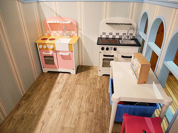 裡面有木製溜滑梯、小朋友最愛的廚師餐廳,桌面下也收納許多玩具