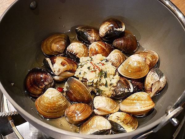 蛤蜊會先爆炒,炒完之後將爆開的蛤蠣先起鍋,接著加入高湯, 像是一鍋兩吃的概念,